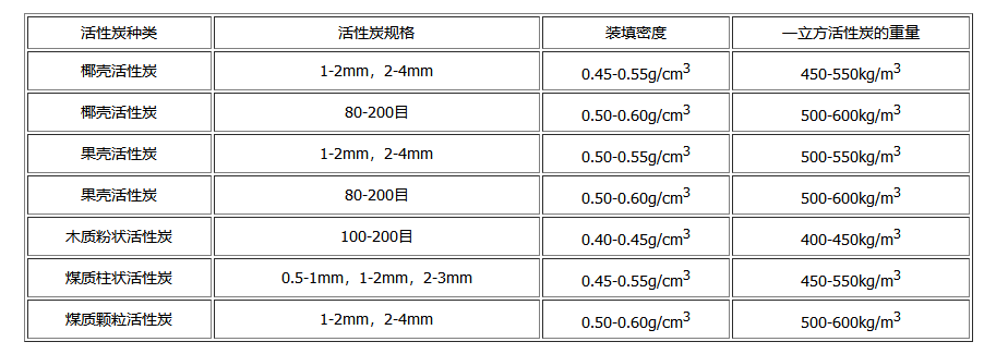 下表是竹之韻活性炭廠家根據(jù)產(chǎn)品的實(shí)際情況,為大家總結(jié)幾種不同類(lèi)型活性炭產(chǎn)品的裝填密度,以及不同規(guī)格、種類(lèi)活性炭一立方的重量,希望對(duì)大家有所幫助。
